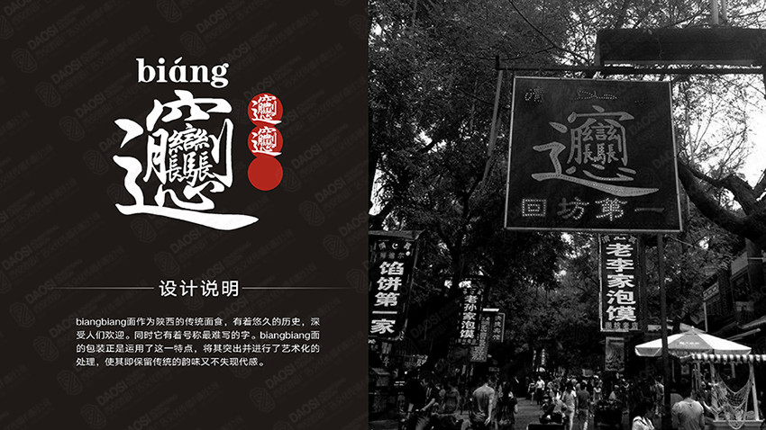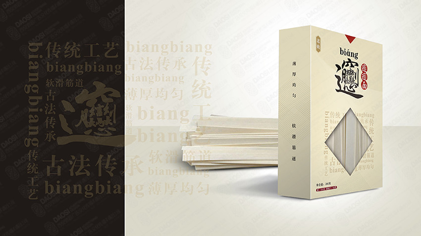 - 設(shè)計首先考慮的是陜西的歷史文化沉淀,所以以“言”為出發(fā)點,biangbiang面的包裝正是運(yùn)用了這一特點,將其突出并進(jìn)行了藝術(shù)化的處理,使其即保留傳統(tǒng)的韻味又不失現(xiàn)代感。